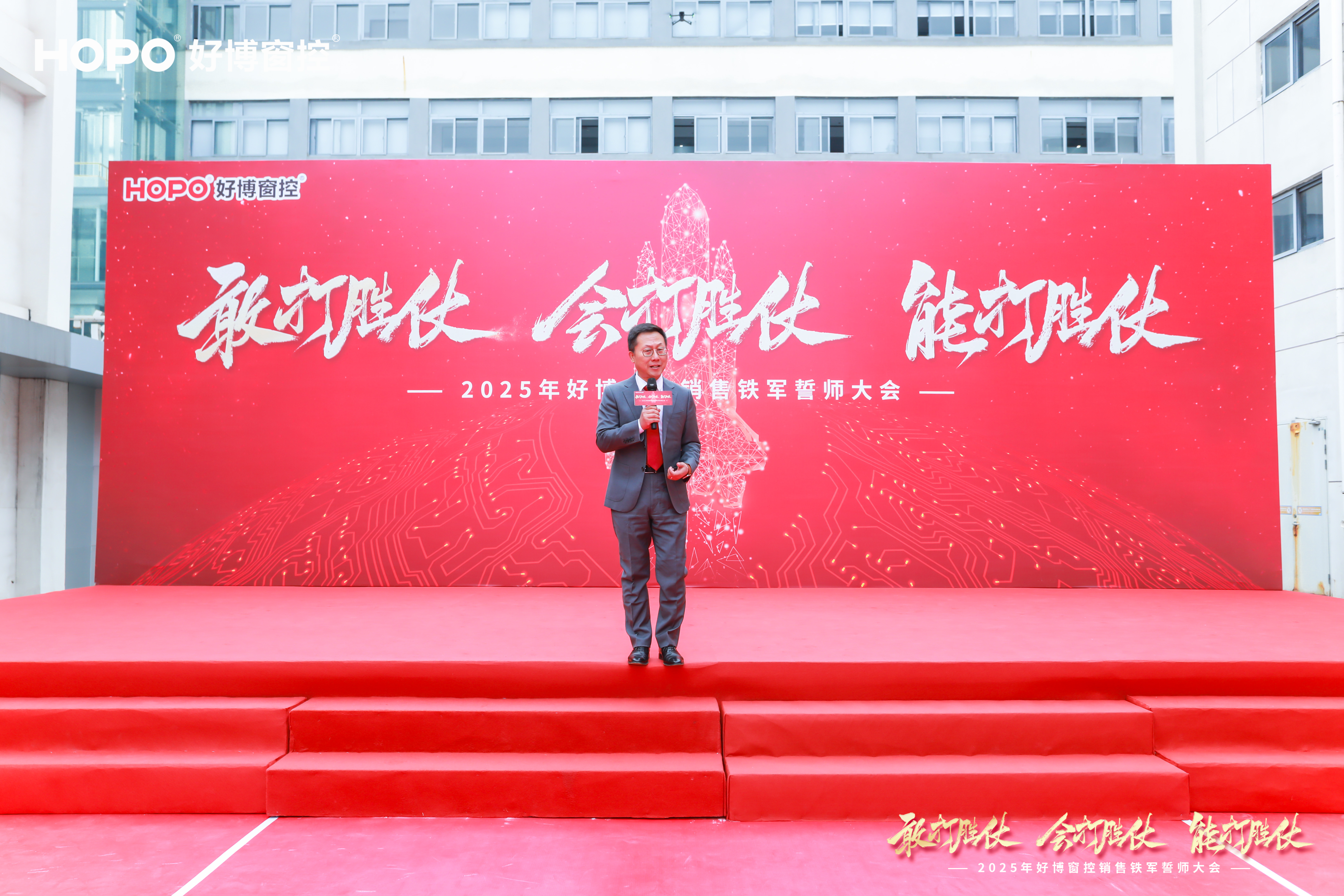在随后的代表发言环节,HOPO新疆(乌鲁木齐)用户体验中心总经理王凯作为区域合作伙伴代表,表达了对2025年目标达成的坚定信心;HOPO西北大区执行经理黄舒哲表示,唯有凝聚团队向心力,以协作共赢为利刃,为区域市场开拓、业绩增长筑牢根基;刘云鹏与鲍传伟两位销售精英代表则结合自身经验,为全体将士注入实战动力;钻石保障军团代表星空电竞窗控产品项目管理中心总经理刘治国更是郑重承诺,将以卓越品质的产品和持续的创新技术为前线提供坚实后盾。