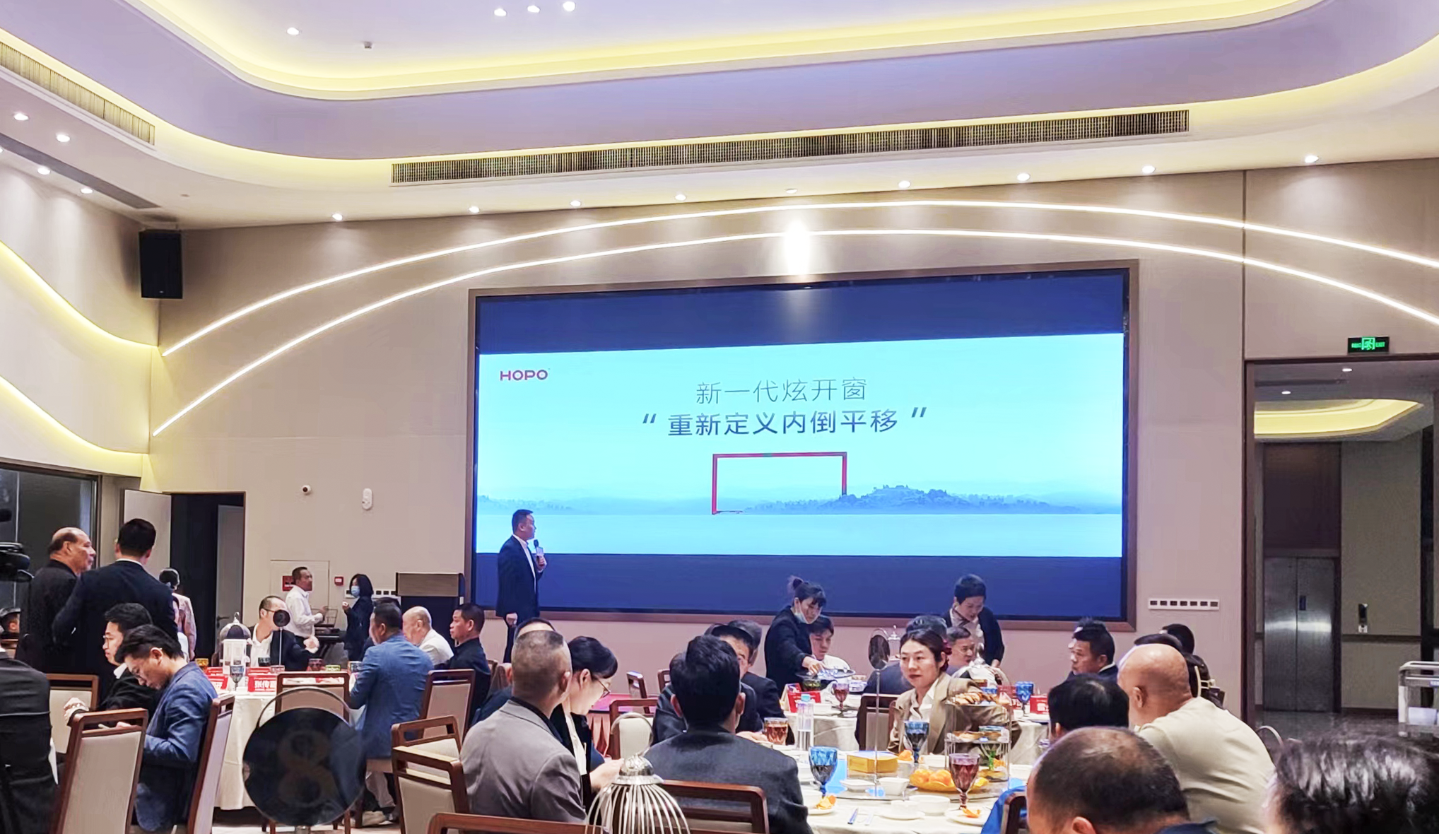 在晚上举行的广东省门业协会迎春团拜会上,星空电竞窗控张勇作为发言代表,上台展示了HOPO针对市场需求和用户痛点进行产品研发的典型案例——内倒平移炫开窗五金控制系统。
